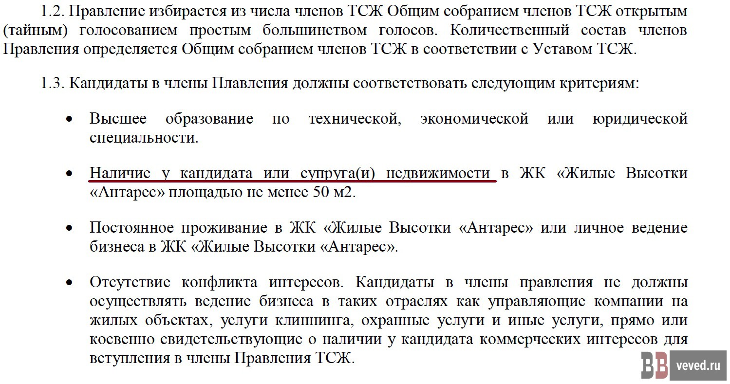 «Чужаки» в руководстве? Жильцы также пожаловались на то, что в новом положении прописали возможность избрания в правление лица, не являющегося собственником квартиры в доме. Как они утверждают, теперь достаточно, чтобы у кандидата (или его супруга) имелось жильё в доме площадью не менее 50 квадратных метров. Подписавшиеся под жалобой считают, что фактически дверь в руководство приоткрыли для людей со стороны — например, родственников или деловых партнёров, что противоречит самой природе ТСЖ. Обычно члены правления – это сами собственники, заинтересованные в благополучии дома, а не посторонние люди, возмущаются жильцы. И опасаются, что сделано это под конкретных лиц, близких к действующему председателю: чтобы они могли сохранить контроль, даже не владея недвижимостью в комплексе.