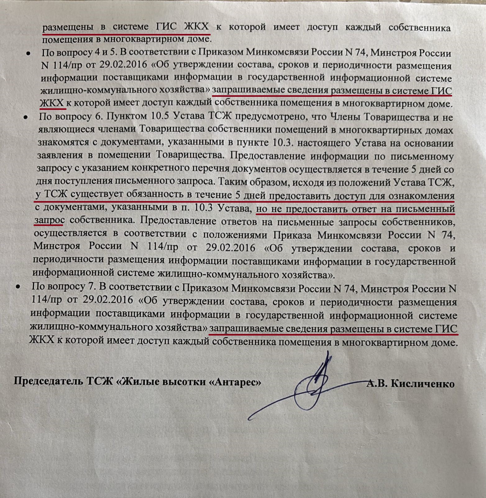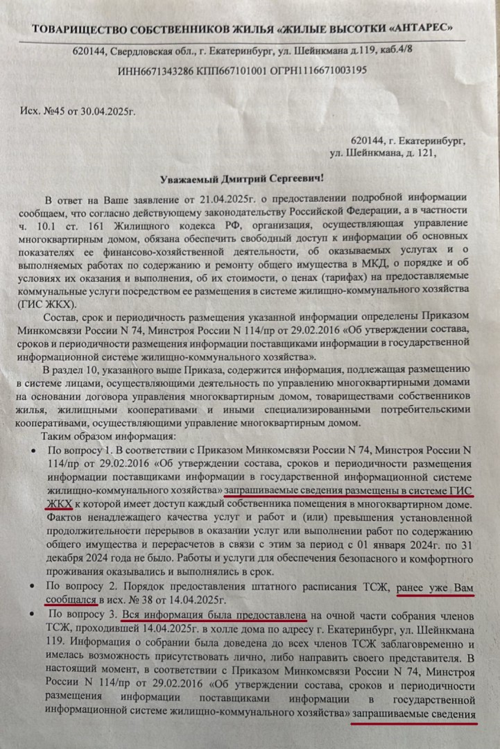 Отсутствие ответов по существу на запросы собственников. Согласно уставу ТСЖ, правление обязано в установленный срок предоставлять информацию членам товарищества по их письменному обращению. Однако, как утверждается в жалобе, эти нормы нарушаются – ответы либо задерживаются, либо в них отсутствует содержательная информация. Жильцы писали заявления с просьбой предоставить копии некоторых договоров, но вместо этого председатель отвечал формальной фразой: «вся запрашиваемая информация размещена на ГИС ЖКХ».