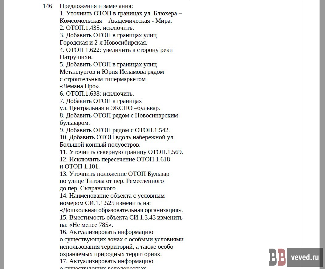 При этом предложения другого участника в количестве 39, не касающиеся добавления ОТОП, а касающиеся только их исключения и уточнения границ, мэрия поддержала в полном объёме. В частности, из ОТОП одобрили исключение зелёной зоны по улице Юлиуса Фучика у Южного парка.