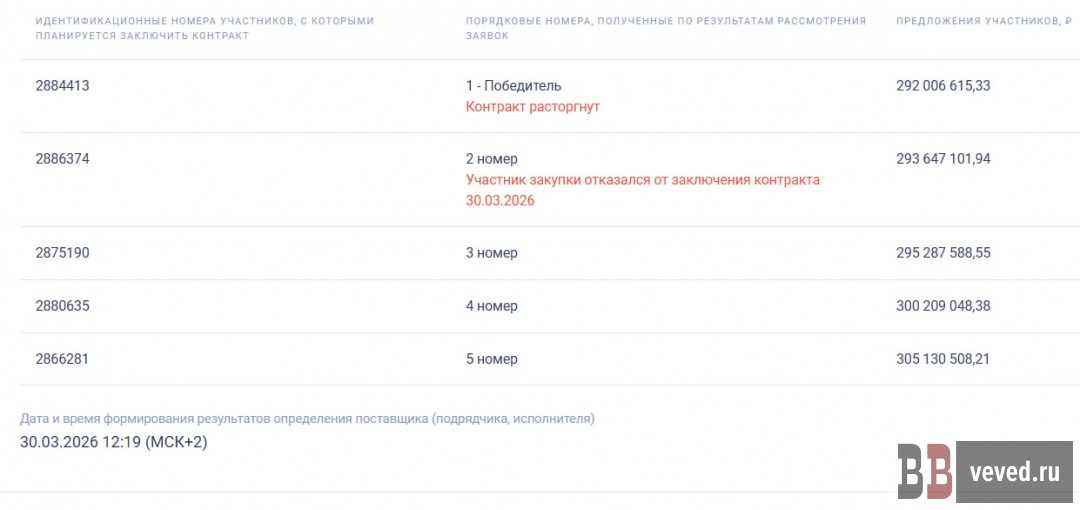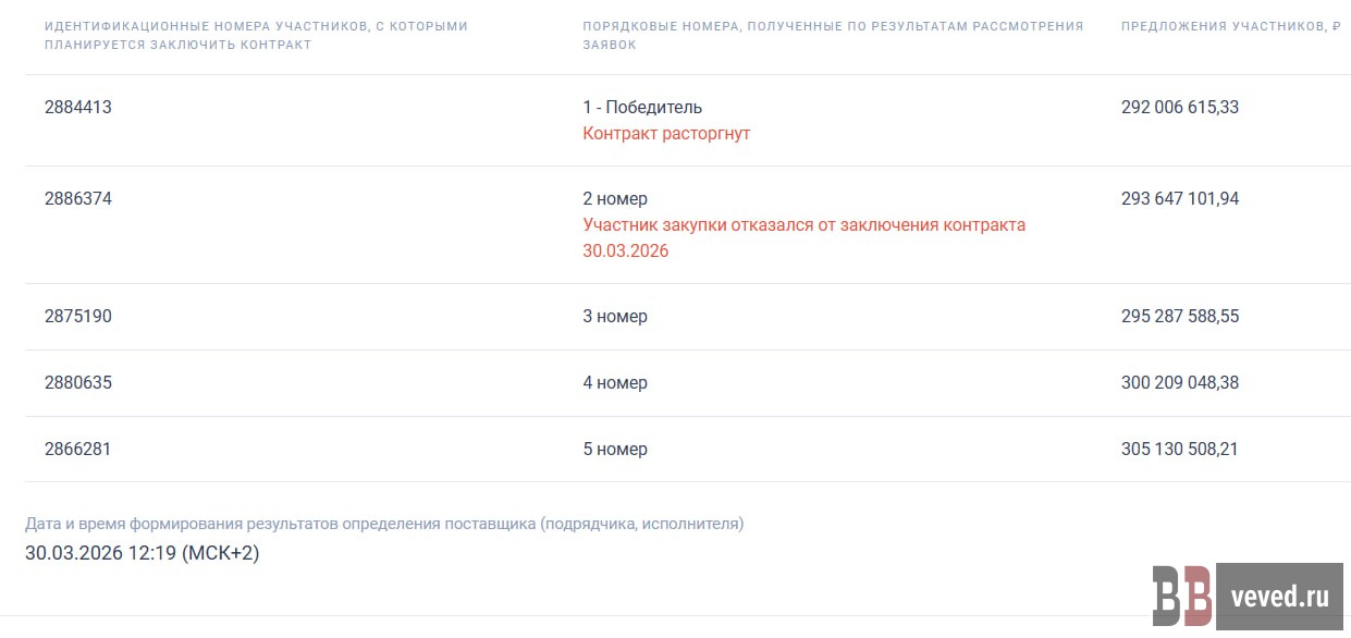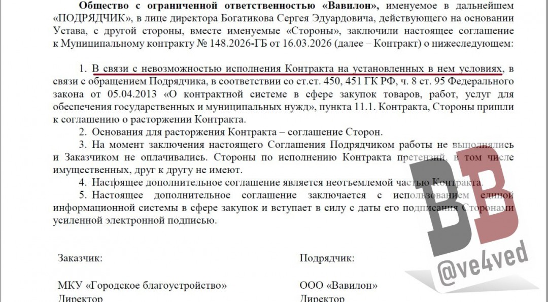 Информация о расторжении контракта появилась сегодня в карточке госзакупки. Изначально контракт был подписан со стороны ООО «Вавилон» 13 марта, работы должны были завершиться до 31 декабря 2027 года.