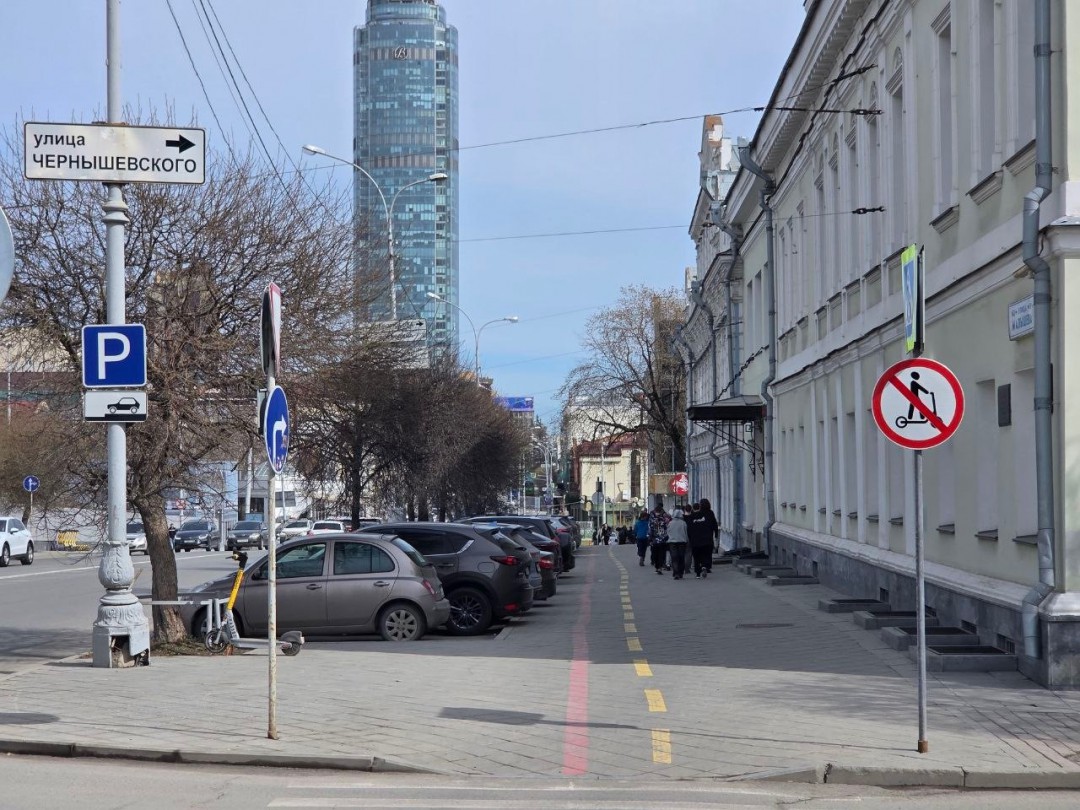 — Давайте посмотрим на конкретный участок на улице Малышева. Что мы видим: движение СИМ запретили, при этом в прошлом году здесь сделали ремонт и организовали бесплатную перпендикулярную парковку за счёт тротуара.