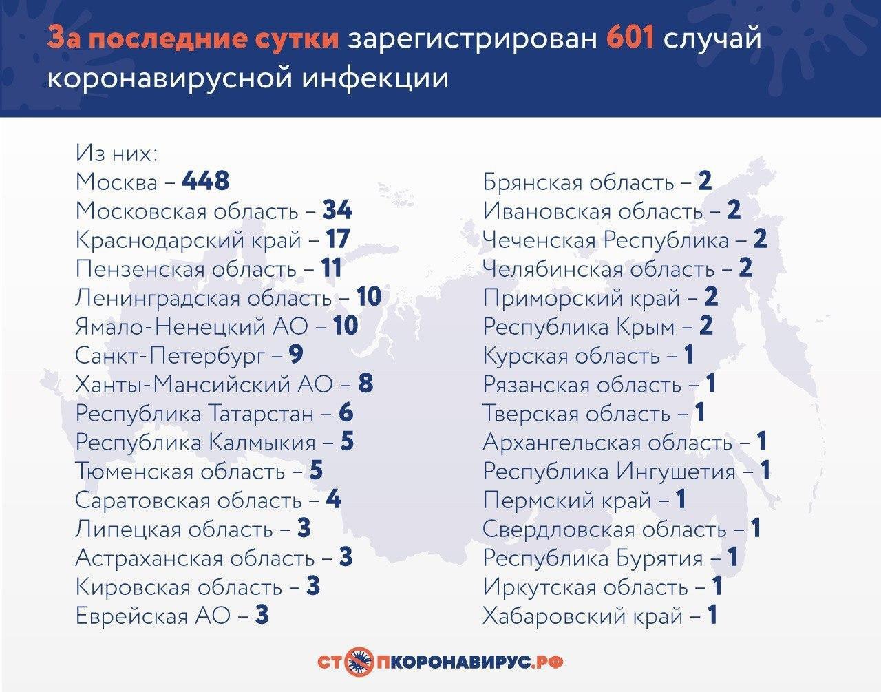 За последние сутки в России официально подтвержден 601 новый случай заражения коронавирусом в 32 регионах, зафиксировано четыре летальных исхода.