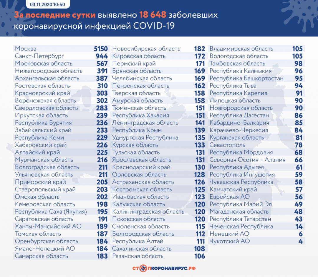 В России коронавирусом заболели еще 18 648 человек