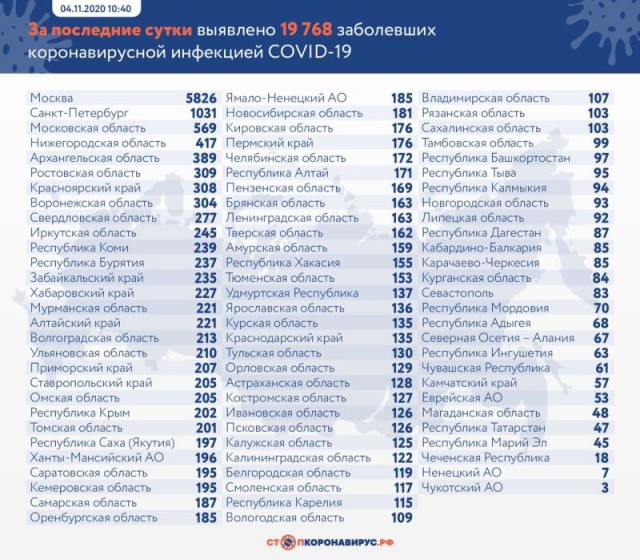 За сутки в России подтвердили 19 768 случаев коронавируса, из них 4 937 случаев (25,0%) выявлено активно у контактных лиц без клинических проявлений болезни. Всего в стране зафиксировано 1 693 454 заболевших.