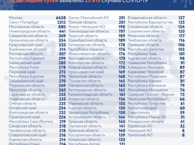 За сутки в России подтвердили 23 610 случаев коронавируса, из них 6 078 (25,7%) случаев выявлено активно у контактных лиц без клинических проявлений болезни. Всего в стране зафиксировано 2 015 608 заболевших COVID-19.