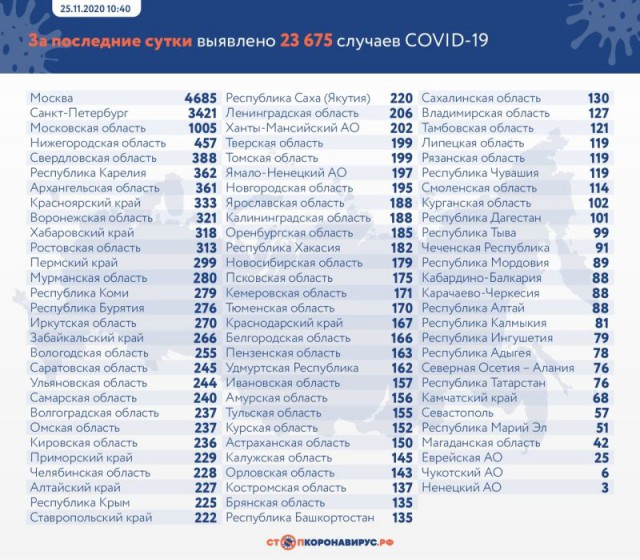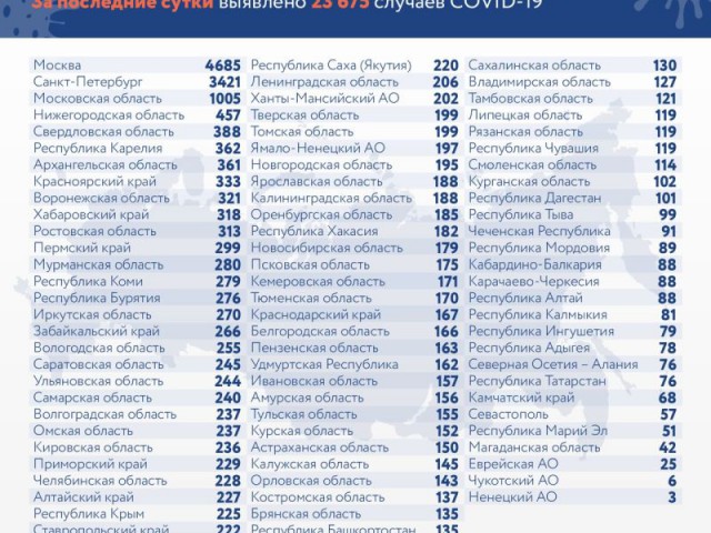 За сутки в России выявили 23 675 случаев коронавируса, из них 5 156 (21,8%) — активно у контактных лиц без клинических проявлений болезни. Всего в стране зафиксировано 2 162 503 заболевших COVID-19.