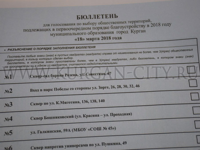 Принять участие в рейтинговом голосовании смогут жители Кургана, достигшие 14-летнего возраста, предъявив паспорт или другой документ, подтверждающий факт регистрации по месту жительства на территории города. Как уточнил Жижин, если в бюллетене будет указано больше трех объектов, он будет считаться недействительным.