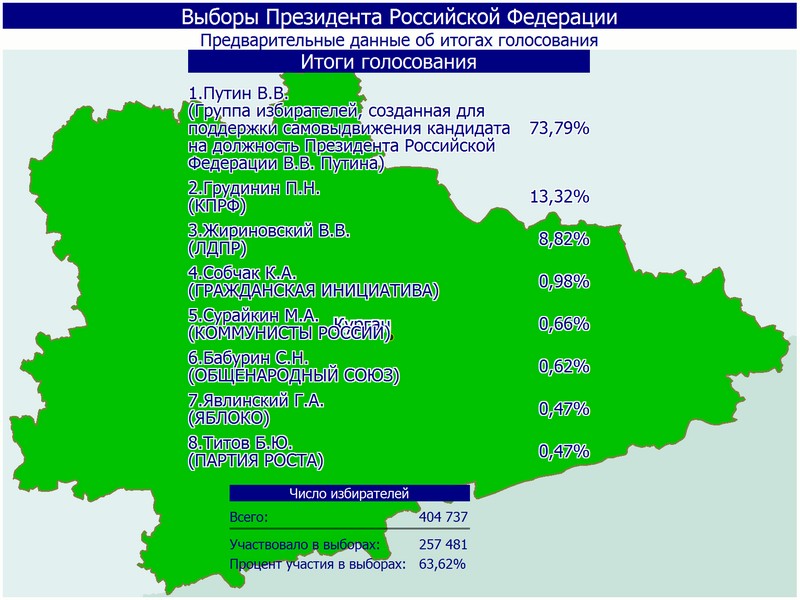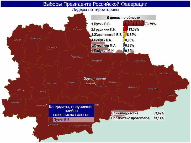 По предварительным данным Избирательной комиссии Курганской области, на вечер 18 марта обработано более 73 % процентов протоколов участковых избирательных комиссий.