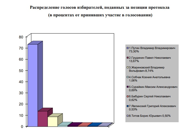 За кандидата от КПРФ Павла Грудинина проголосовали 13,67 % избирателей. За лидера ЛДПР Владимира Жириновского — 8,74 %. Ксения Собчак набрала 1,06 %. Остальные кандидаты недотянули и до одного процента.