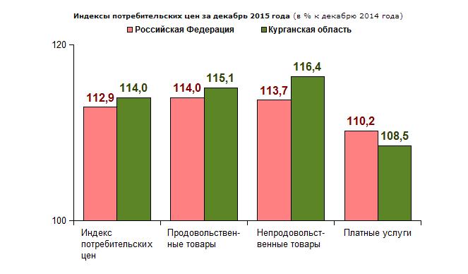 Уровень инфляции на потребительском рынке в Курганской области составил 114% к декабрю 2014 года, в том числе на продовольственные товары – 115,1%, на непродовольственные товары – 116,4%, на платные услуги – 108,5%. Такие данные опубликовал региональный департамент экономического развития в докладе о социально-экономическом положении региона за 2015 год.