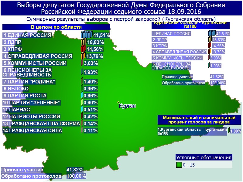 Избирательная комиссия Курганской области опубликовала предварительные итоги выборов в Государственную Думу. В голосовании по партийным спискам «Единая Россия» набрала 41,51% голосов избирателей, ЛДПР – 18,83%, КПРФ – 14,56%, «Справедливая Россия» – 13,79%. Остальные партии не преодолели пятипроцентный барьер.