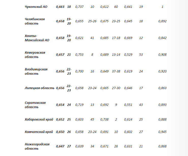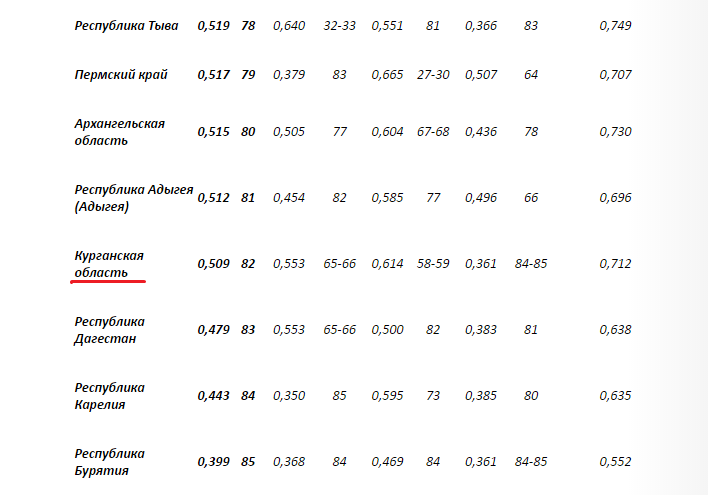 Зауралье в политико-управленческом блоке заняло 65–66-е ранги. Точно такие же результаты показал Дагестан. В социальном блоке регион оказался на 58–59-х местах, как и Удмуртская Республика. В финансово-экономическом блоке Курганская область поделила последнее место с Бурятией, которая стала главным аутсайдером рейтинга. Общий итог Курганской области – 82-е место.